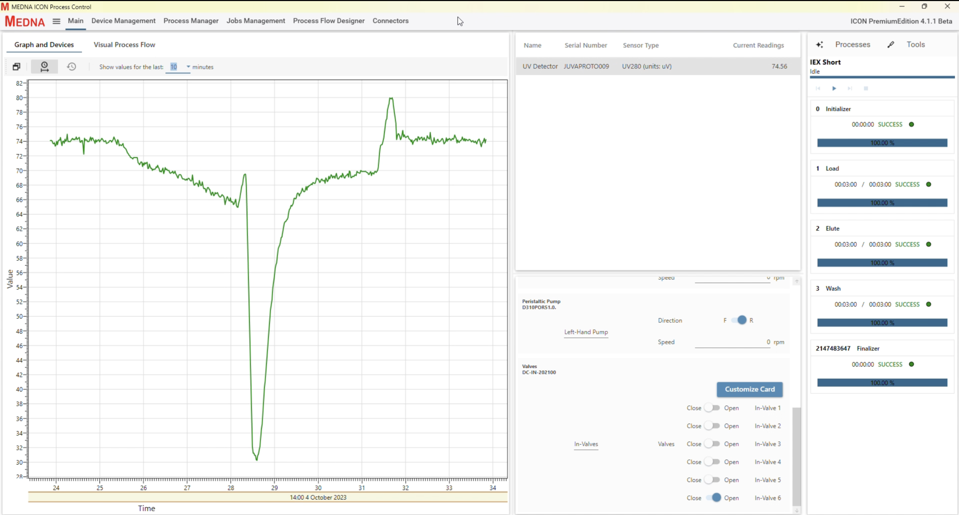 MEDNA™ VASO is a fluid movement system designed for the efficient and automated purification of biomolecules. VASO uses MEDNA's proprietary ICON software to perform automated processes including the purification of proteins and nucleic acids. VASO is composed of interchangeable valves, pumps, sensors, and other devices to run processes that transmit fluid between designated inputs and outputs. VASO is paired with JUVA UV detectors to identify outgoing fluids.
